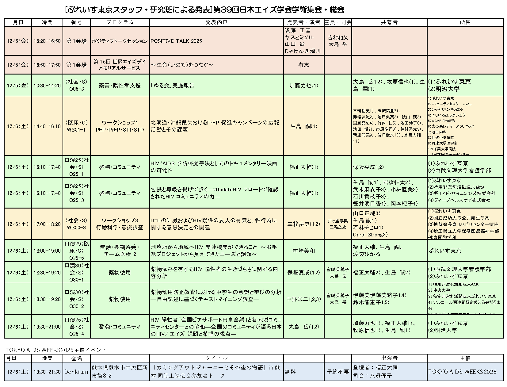 第39回日本エイズ学会・学術集会(学会長:吉村和久 東京都健康安全研究センター所⾧)が熊本で開催されます。ぷれいす東京スタッフや研究班からの発表がありますので、よろしければご覧ください。
